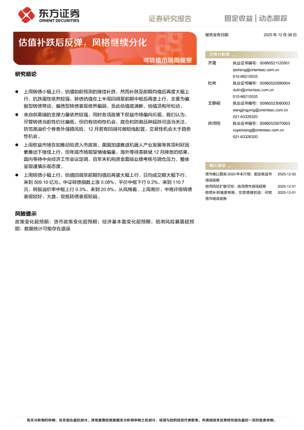 【东方证券】【202512】可转债市场周观察_估值补跌后反弹_风格继续分化-10页