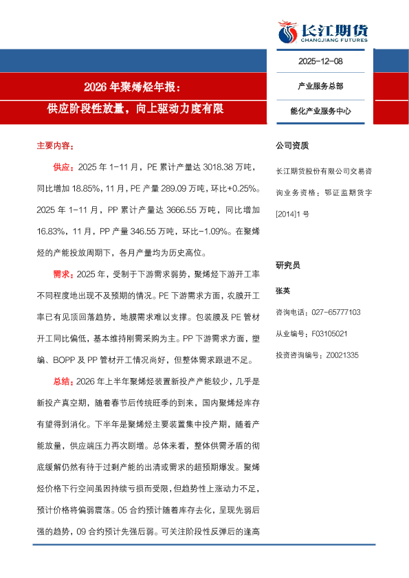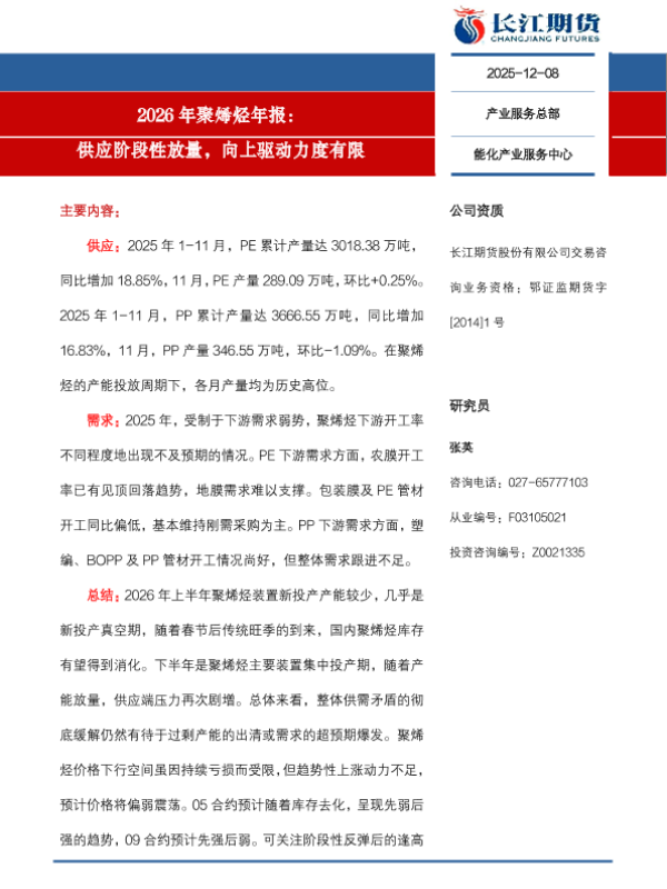 【长江期货】【202512】2026年聚烯烃年报:供应阶段性放量,向上驱动力度有限-14页