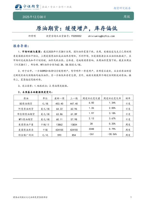【宁证期货】【202512】原油期货:缓慢增产,库存偏低-7页