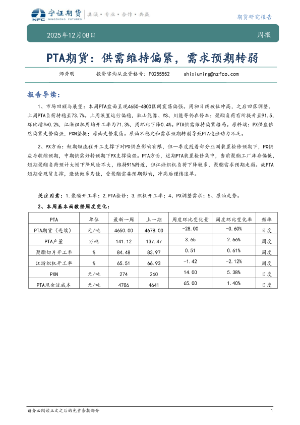 【宁证期货】【202512】PTA期货:供需维持偏紧,需求预期转弱-7页