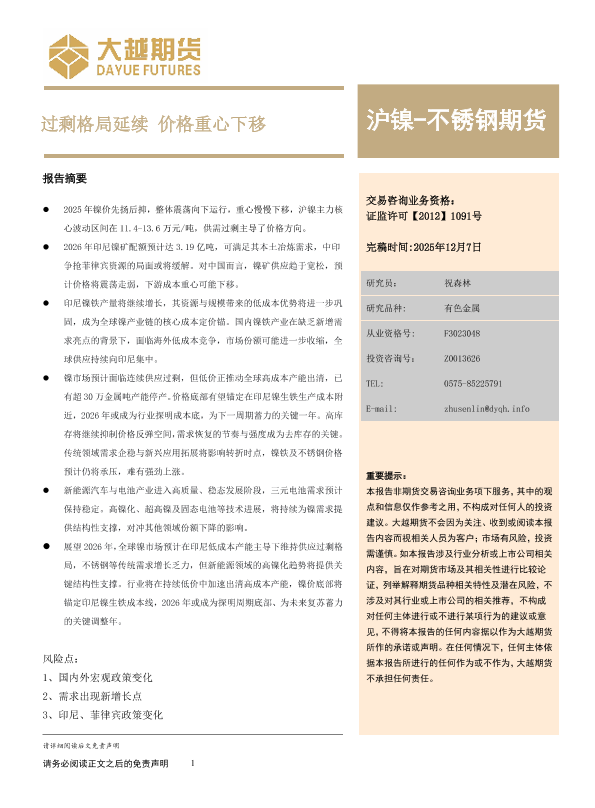 【大越期货】【202512】沪镍-不锈钢期货年度报告_过剩格局延续_价格重心下移-13页