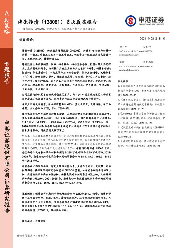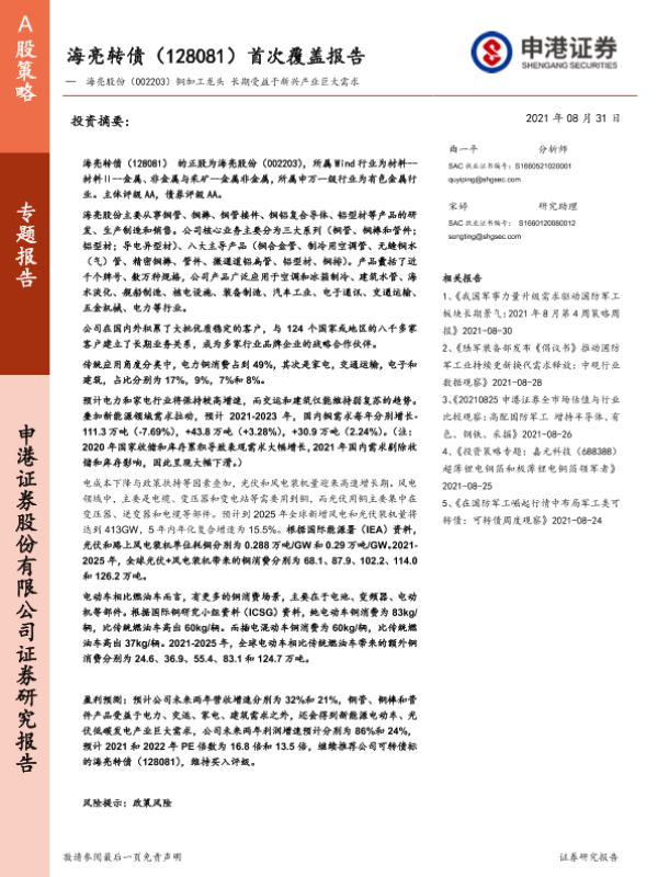 【申港证券】【20210831】海亮转债(128081)首次覆盖报告:海亮股份(002203)铜加工龙头,长期受益于新兴产业巨大需求-30页