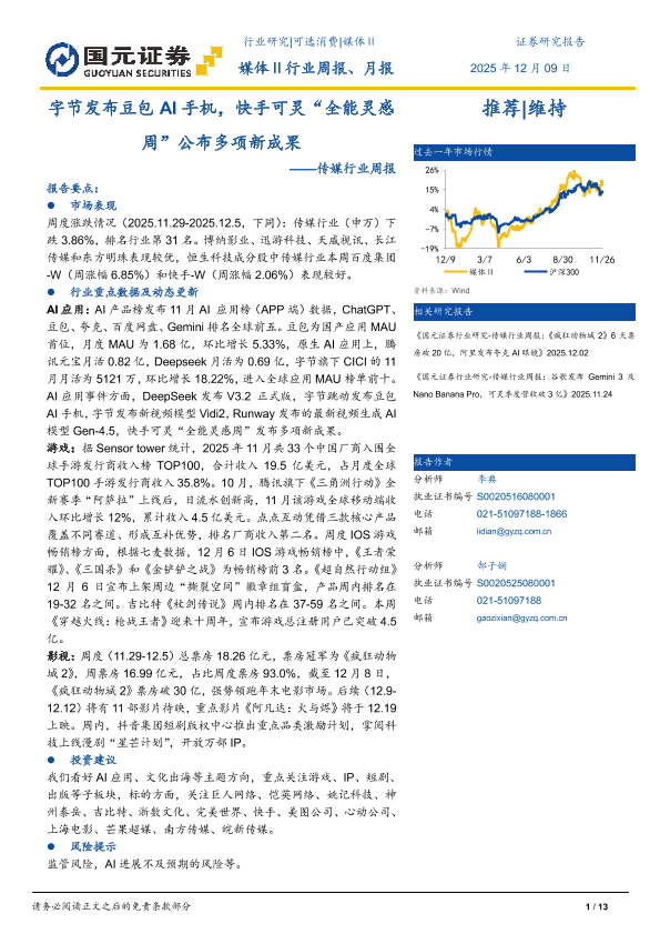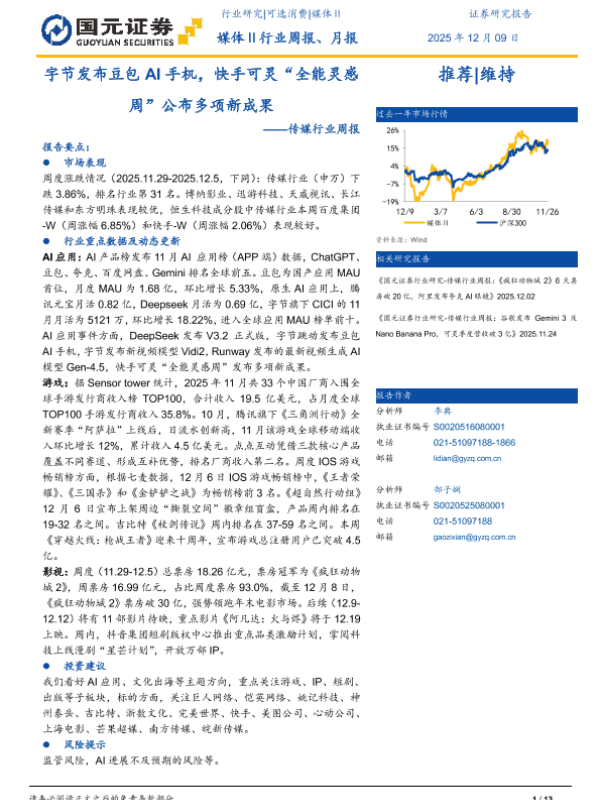 【国元证券】【202512】字节发布豆包AI手机,快手可灵“全能灵感周”公布多项新成果-13页