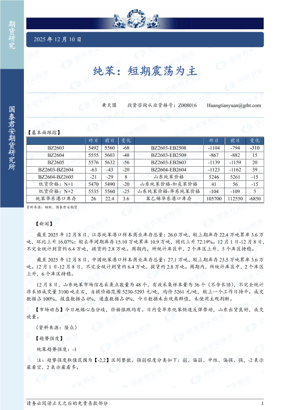 【国泰君安期货】【202512】纯苯:短期震荡为主-2页
