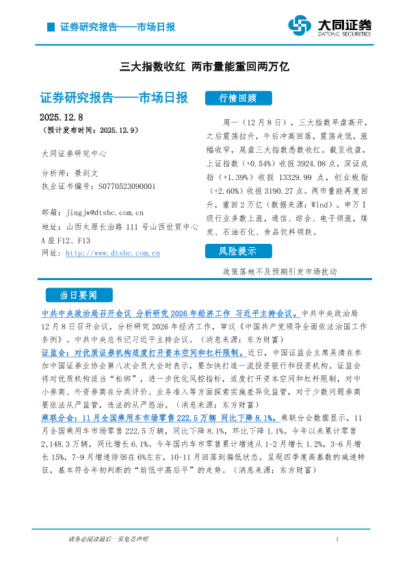 【大同证券研究中心】【202512】市场日报:三大指数收红 两市量能重回两万亿-5页