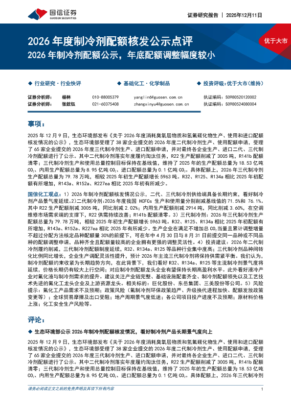 【国信证券】【202512】2026年度制冷剂配额核发公示点评:2026年制冷剂配额公示,年底配额调整幅度较小-6页