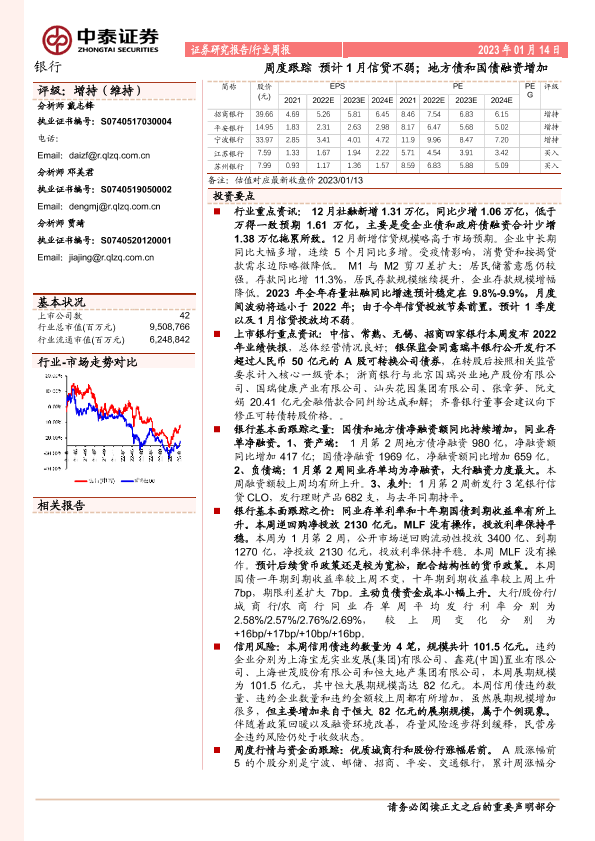 【中泰证券】【20230114】银行周度跟踪:预计1月信贷不弱;地方债和国债融资增加-23页
