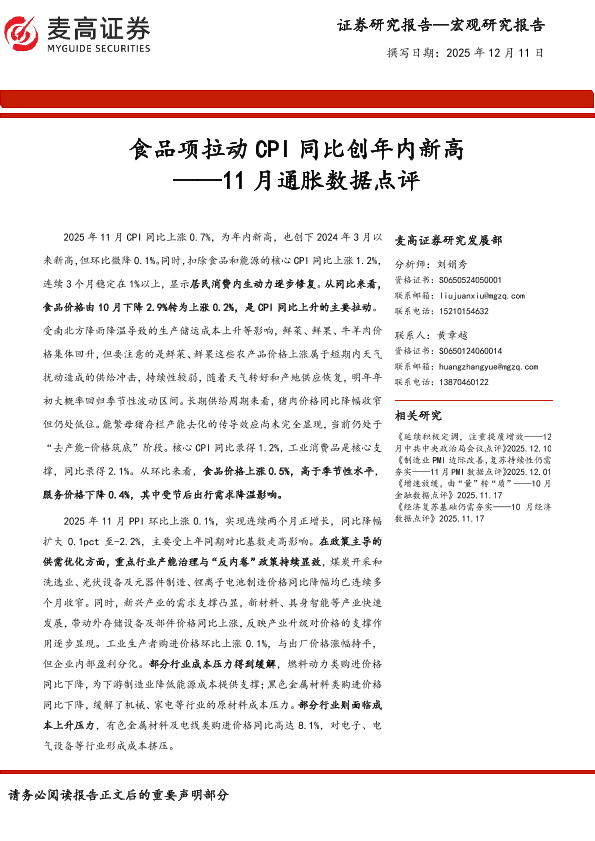 【麦高证券】【202511】食品项拉动 CPI同比创年内新高 ——11月通胀数据点评-10页