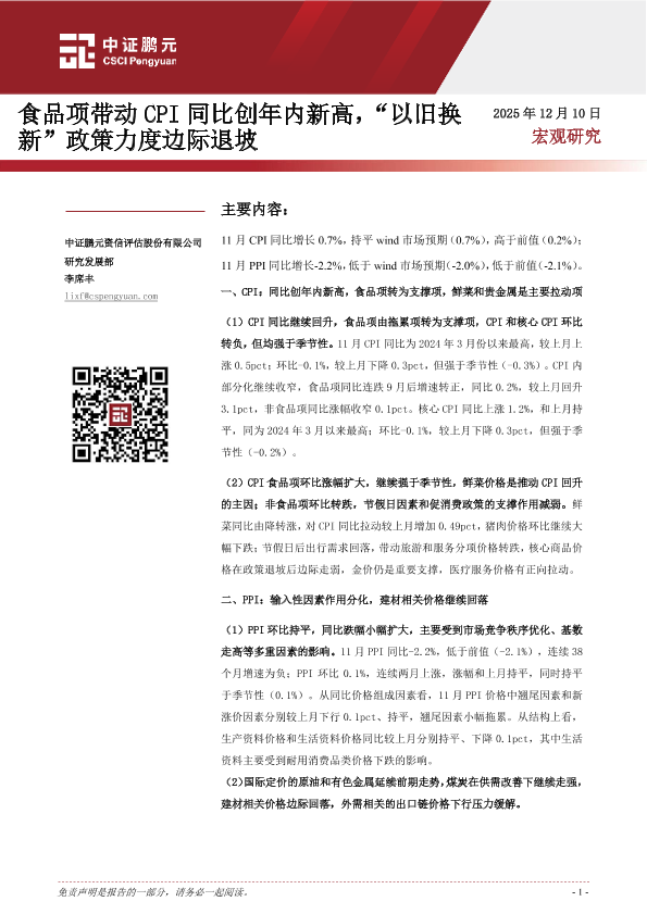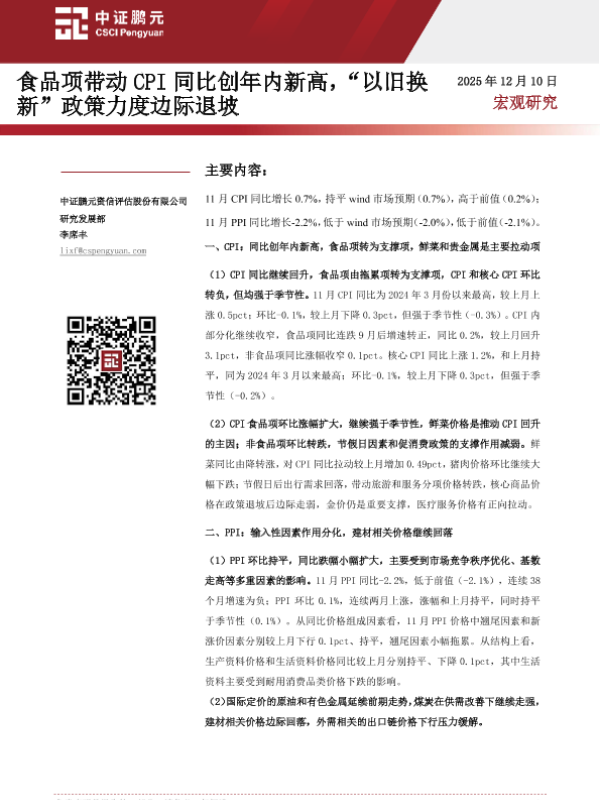 【中证鹏元资信评估股份有限公司】【202512】食品项带动CPI同比创年内新高,“以旧换新”政策力度边际退坡-12页