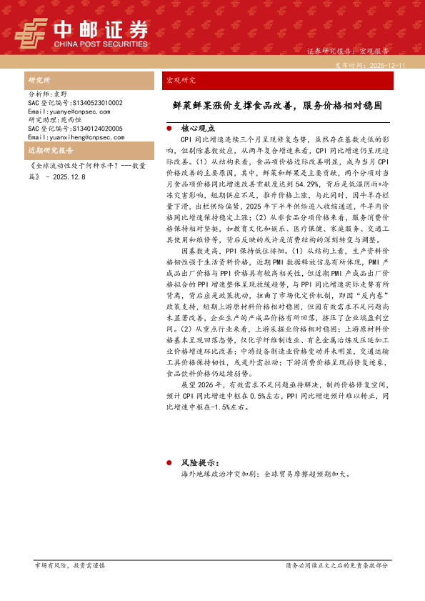 【中邮证券】【202512】鲜菜鲜果涨价支撑食品改善,服务价格相对稳固-10页