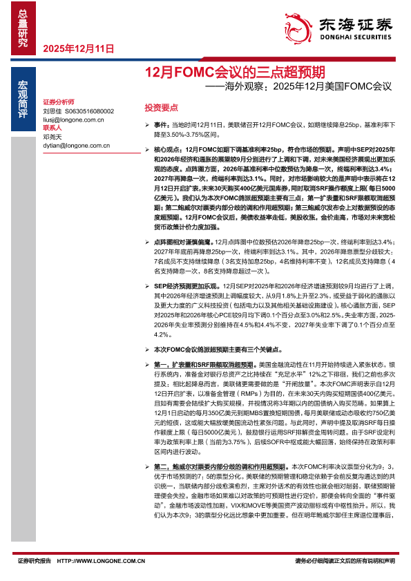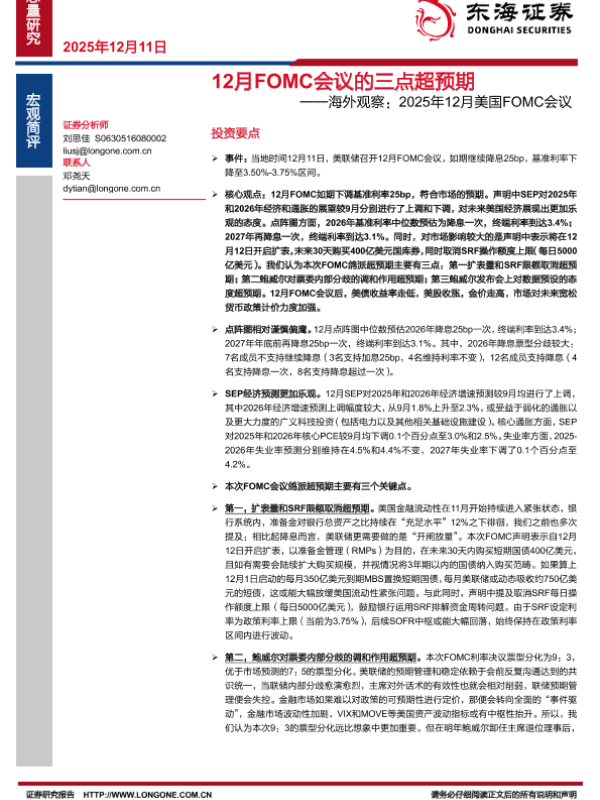 【东海证券】【202512】12月 FOMC会议的三点超预期——海外观察:2025年12月美国 FOMC会议-5页