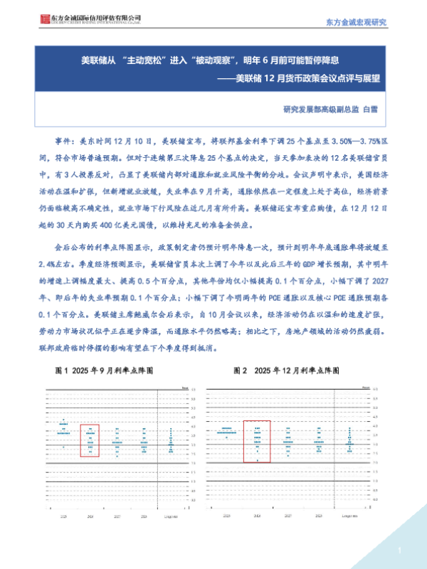 【东方金诚】【202312】美联储从 “主动宽松”进入“被动观察”,明年 6月前可能暂停降息——美联储 12月货币政策会议点评与展望-4页