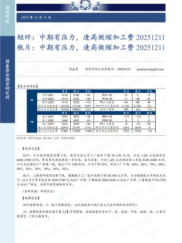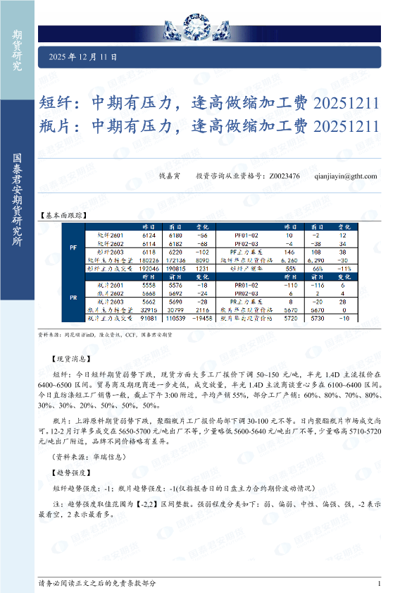 【国泰君安期货】【202512】短纤:中期有压力,逢高做缩加工费 瓶片:中期有压力,逢高做缩加工费-2页