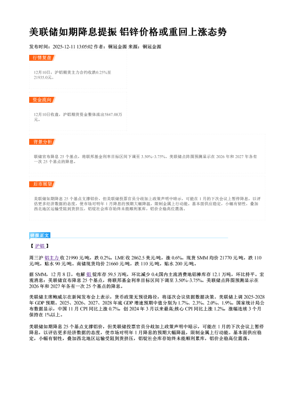 【铜冠金源期货】【202512】美联储如期降息提振铝锌价格或重回上涨态势-2页