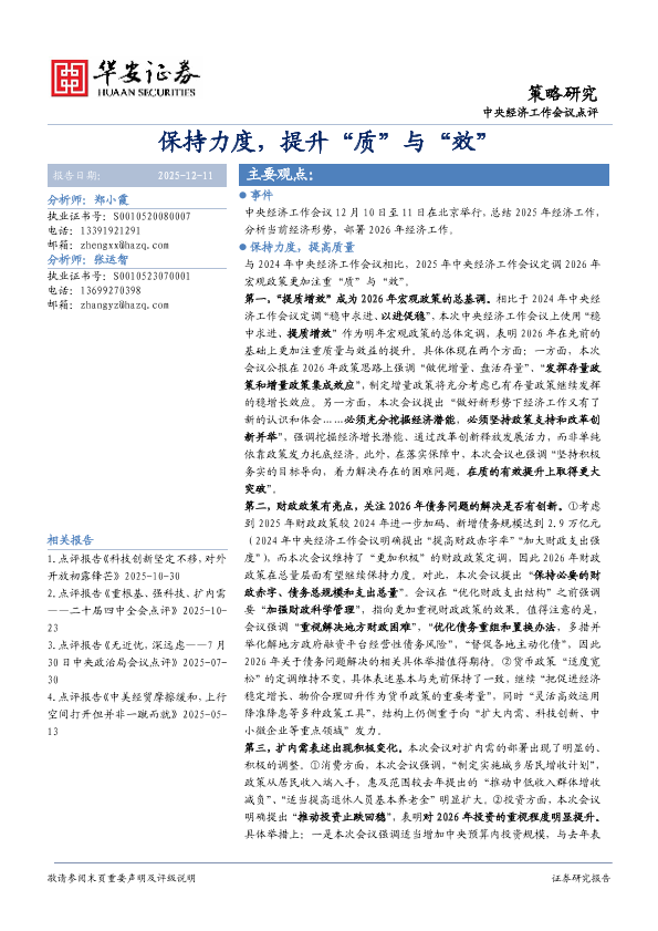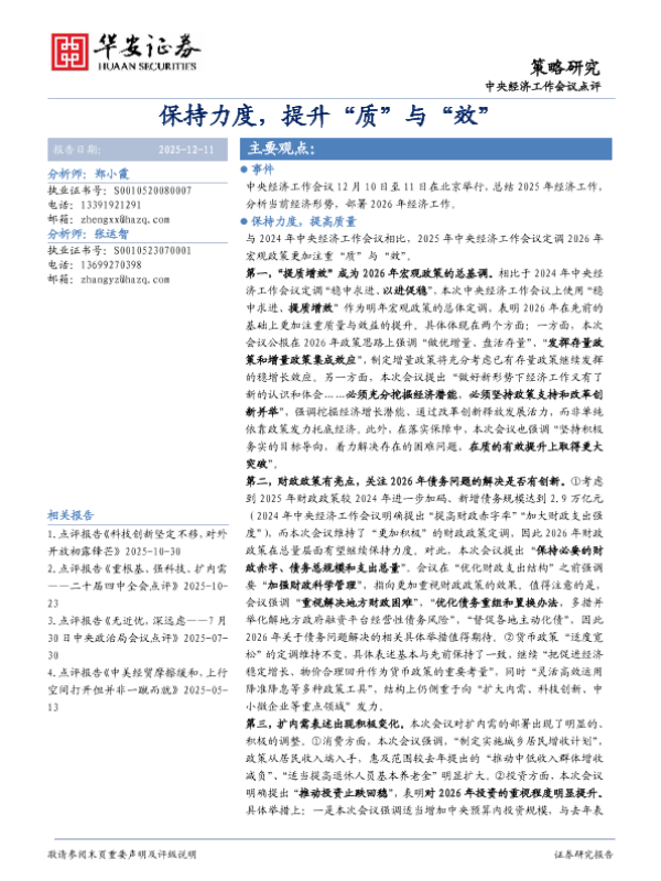 【华安证券】【202512】中央经济工作会议点评:保持力度,提升“质”与“效”-3页