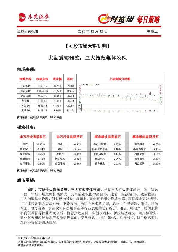 【东莞证券】【202512】2025年12月12日 A股市场大势研判:大盘震荡调整,三大指数集体收跌-4页