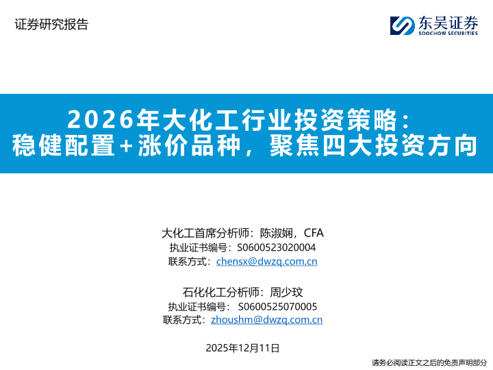 【东吴证券】【202512】2026年大化工行业投资策略:稳健配置+涨价品种,聚焦四大投资方向-93页