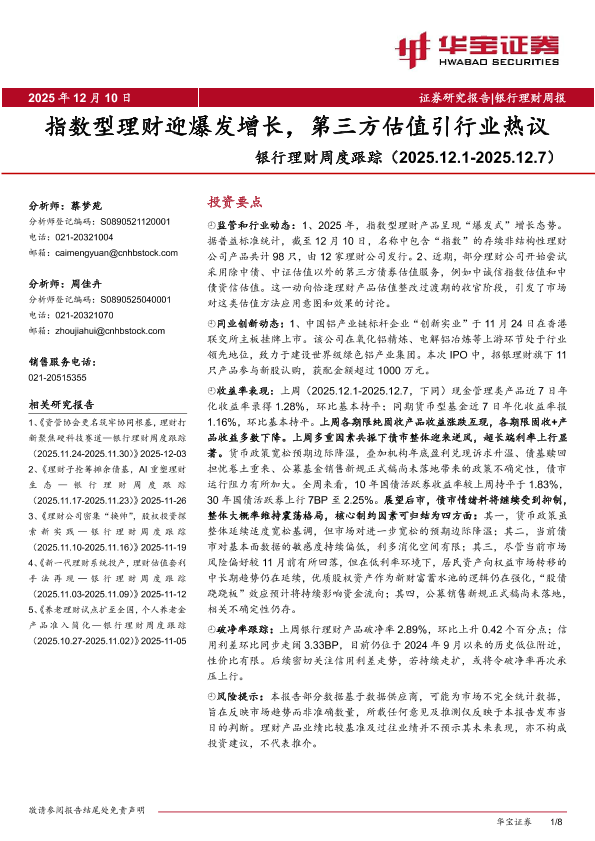 指数型理财 银行理财 破净率 收益率表现 第三方估值