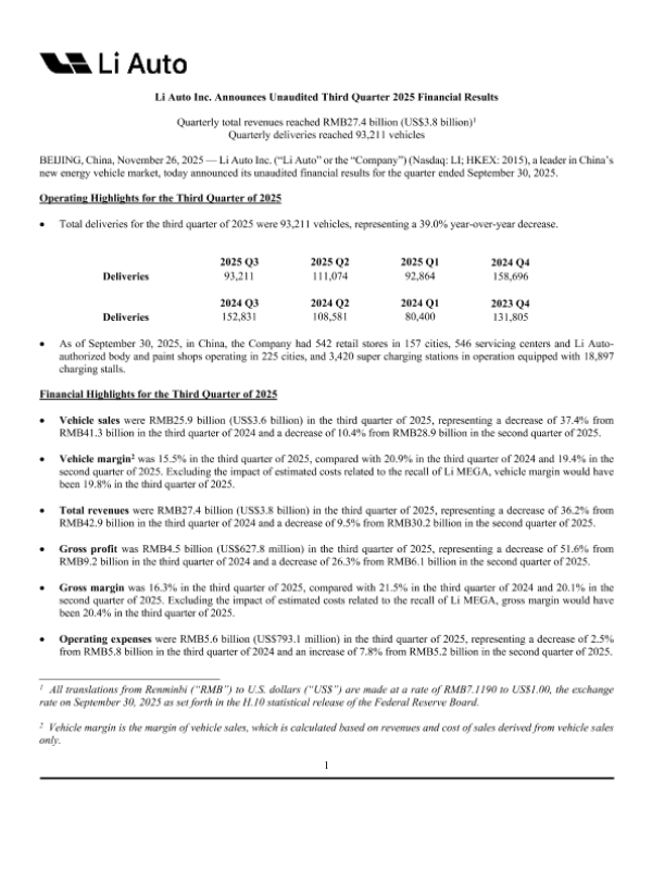 【Li Auto Inc.&NIO Inc.&XPeng Inc.】【2025】Li Auto Inc. Announces Unaudited Third Quarter 2025 Financial Results-30页