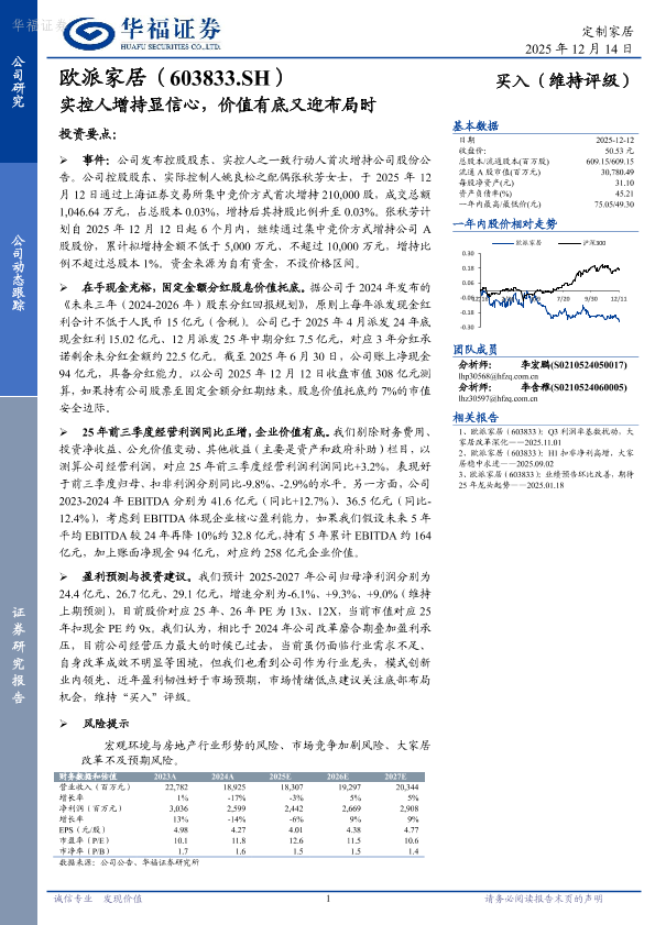 实控人增持 经营利润 欧派家居 分红回报 投资建议