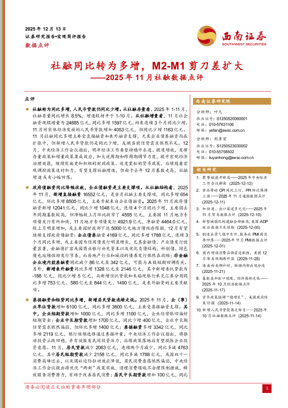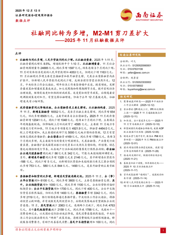 【西南证券】【202512】社融同比转为多增, M2-M1剪刀差扩大——2025年 11月社融数据点评-7页