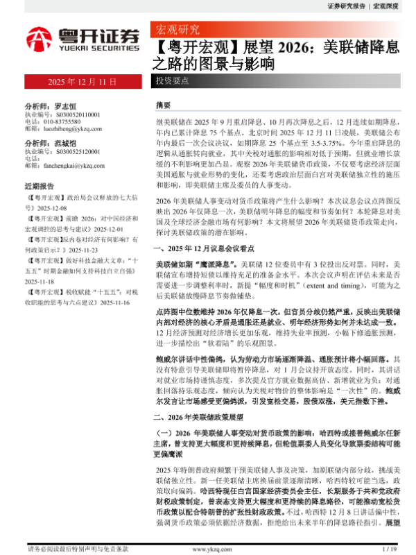 【粤开证券】【202512】展望2026:美联储降息之路的图景与影响-19页