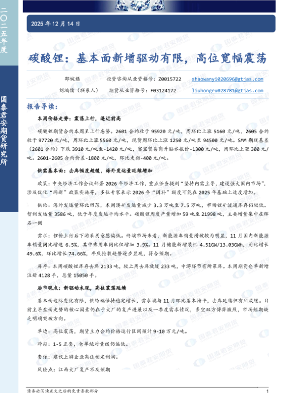 【国泰君安期货】【202512】碳酸锂:基本面新增驱动有限,高位宽幅震荡-9页