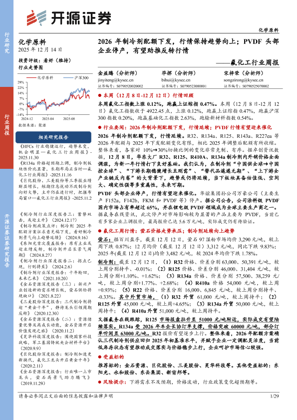 【开源证券】【202512】氟化工行业周报:2026年制冷剂配额下发,行情保持趋势向上;PVDF头部企业停产,有望助推反转行情-29页