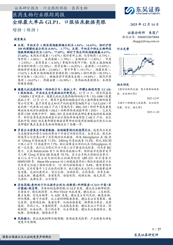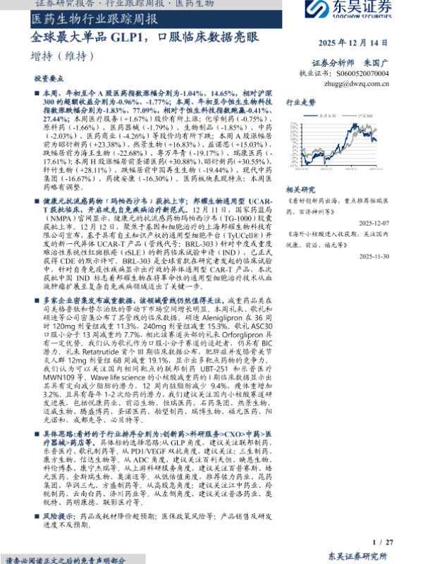 【东吴证券】【202512】医药生物行业跟踪周报·全球最大单品 GLP1,口服临床数据亮眼-27页