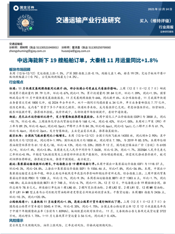 【国金证券】【202512】交通运输产业行业研究:中远海能新下19艘船舶订单,大秦线11月运量同比+1.8%-17页