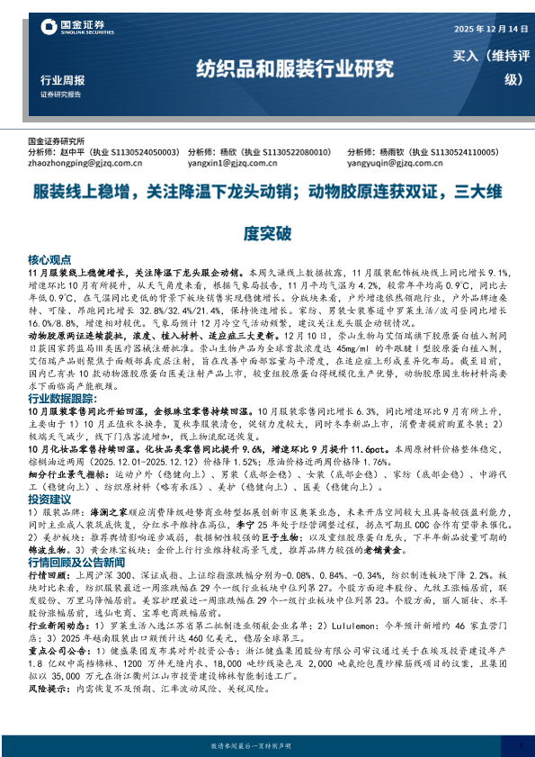 【国金证券】【202512】纺织品和服装行业研究:服装线上稳增,关注降温下龙头动销;动物胶原连获双证,三大维度突破-12页