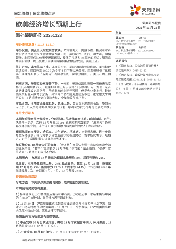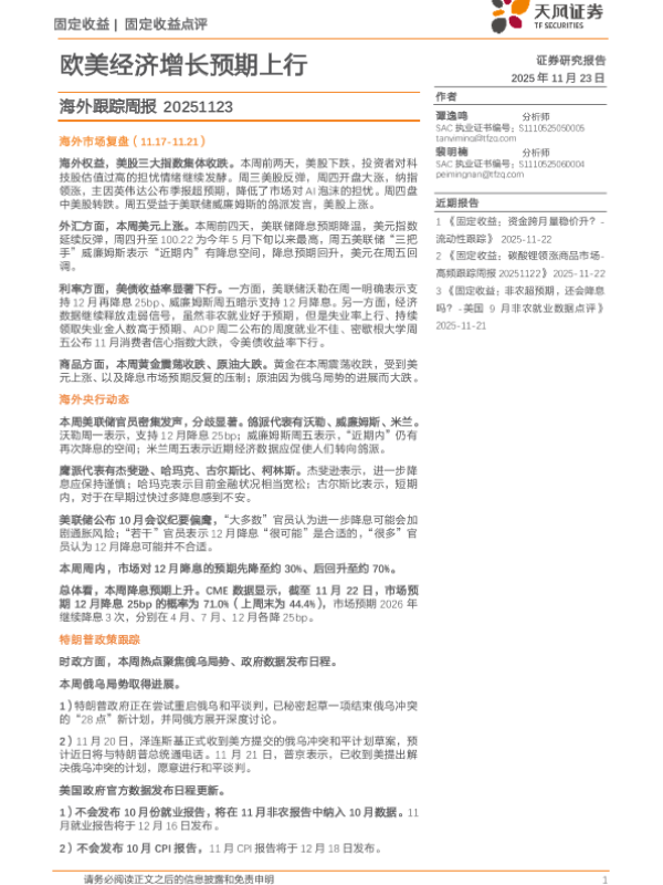 【天风证券】【202511】海外跟踪周报_欧美经济增长预期上行-17页