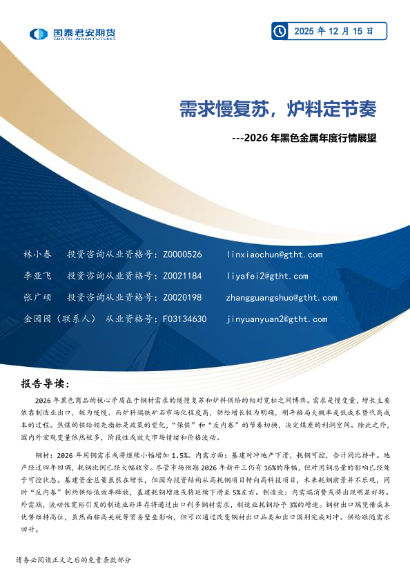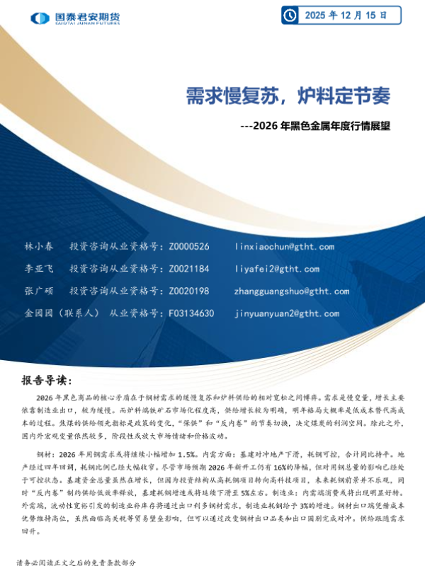 【国泰君安期货研究】【202512】2026年黑色金属年度行情展望:需求慢复苏,炉料定节奏-55页