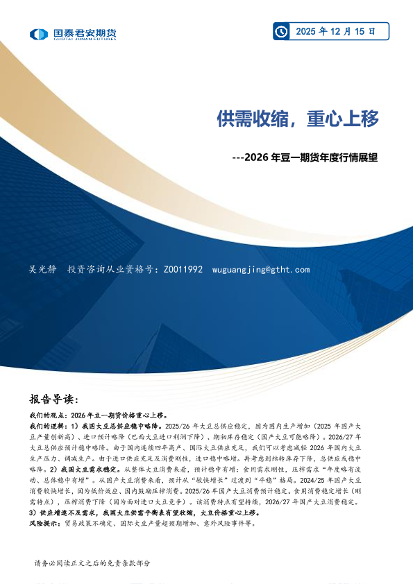 【国泰君安期货】【202512】2026年豆一期货年度行情展望_供需收缩_重心上移-13页