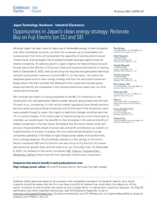 【Goldman Sachs Japan Co.】【20230119】 Opportunities in Japan’s clean energy strategy Reiterate Buy on Fuji Electric(on CL) and SEI-27页