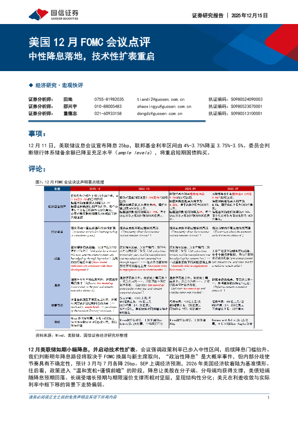 【国信证券】【202512】美国12月FOMC会议点评:中性降息落地,技术性扩表重启-7页