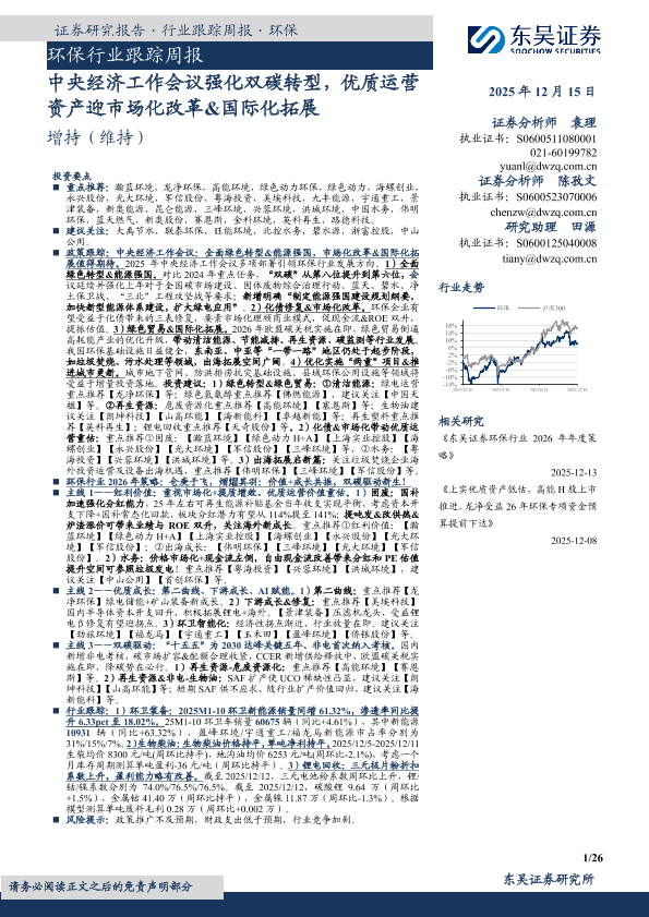 【东吴证券】【202512】环保行业跟踪周报:中央经济工作会议强化双碳转型,优质运营资产迎市场化改革&国际化拓展-26页