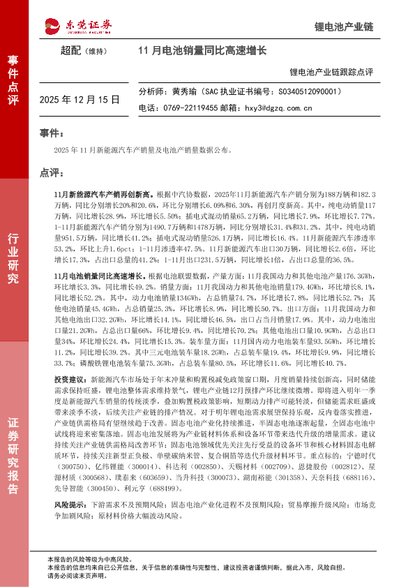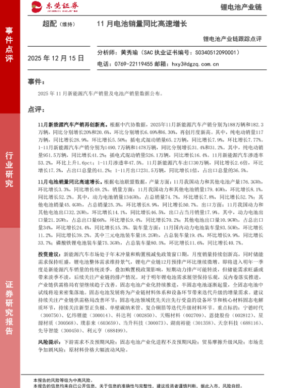 【东莞证券】【202512】锂电池产业链跟踪点评:11月电池销量同比高速增长-2页