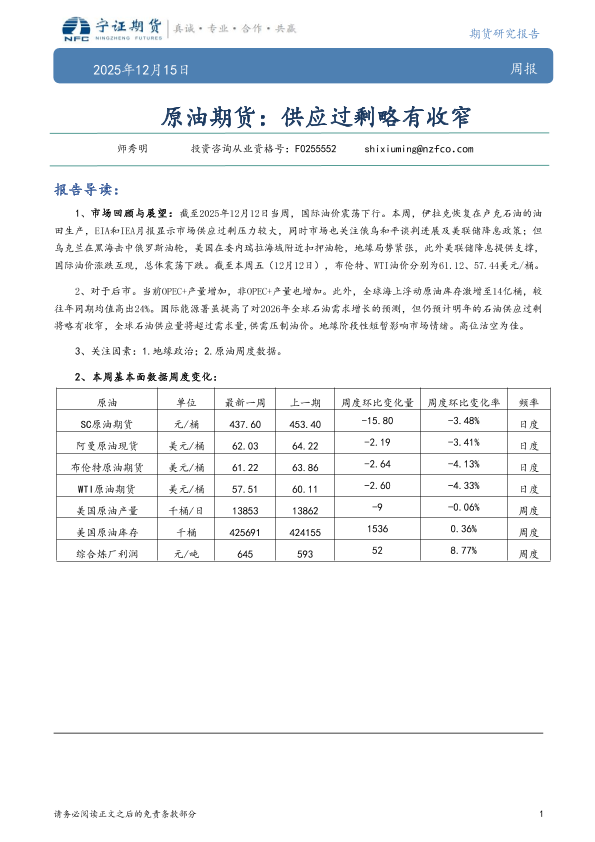 【宁证期货】【202512】原油期货:供应过剩略有收窄-7页