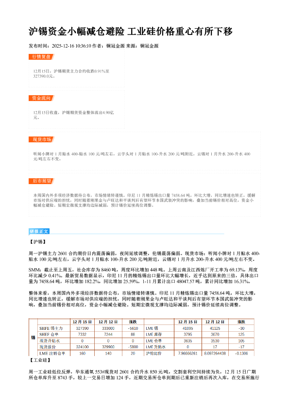 【铜冠金源期货】【202512】沪锡资金小幅减仓避险 工业硅价格重心有所下移-2页