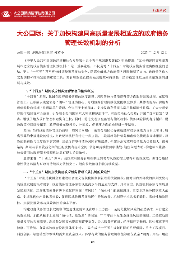 【大公国际】【202512】关于加快构建同高质量发展相适应的政府债务管理长效机制的分析-4页