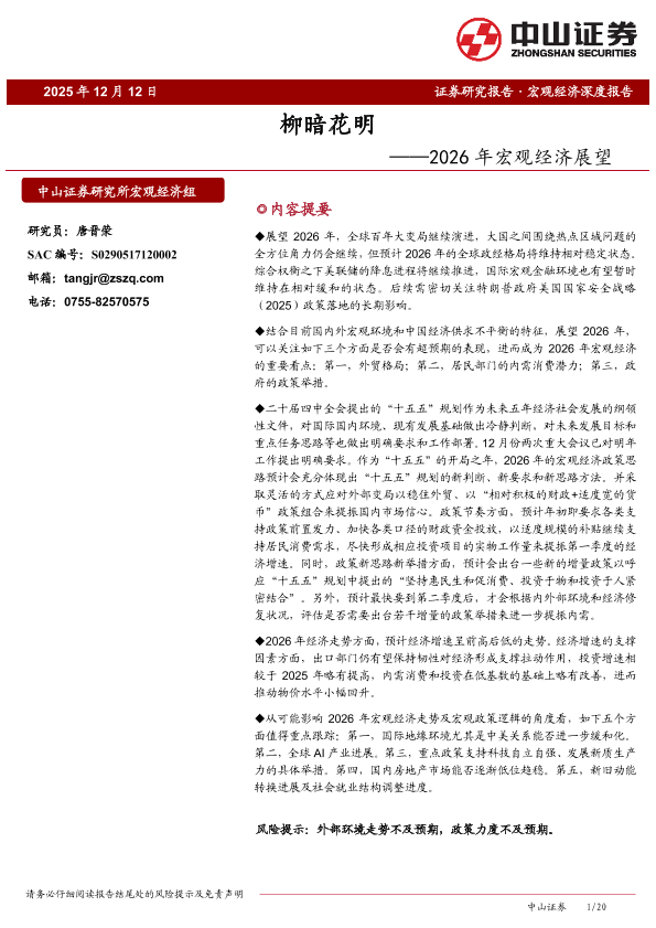 【中山证券研究所宏观经济组】【2026】2026年宏观经济展望:柳暗花明-20页