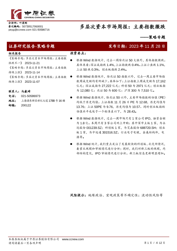 【中原证券】【20231128】策略专题:多层次资本市场周报:主要指数微跌-12页