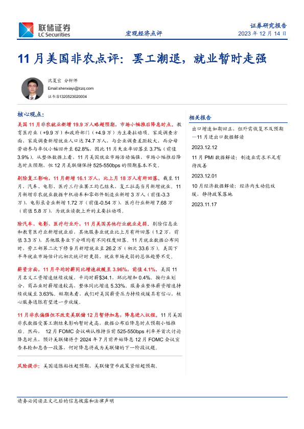 【联储证券】【20231214】11月美国非农点评:罢工潮退,就业暂时走强-10页