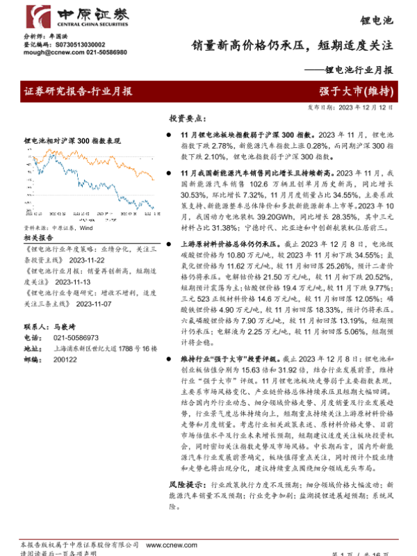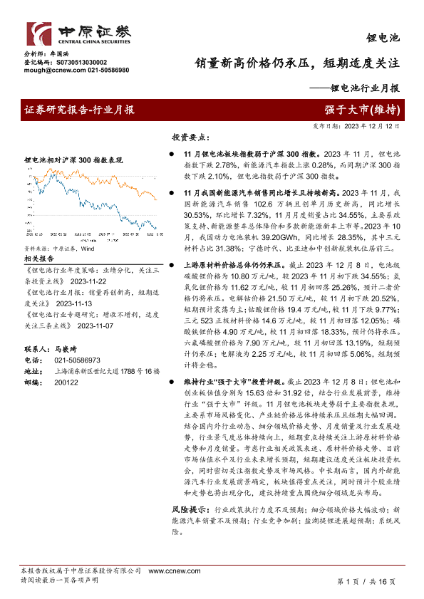 【中原证券】【20231212】锂电池行业月报:销量新高价格仍承压,短期适度关注-16页