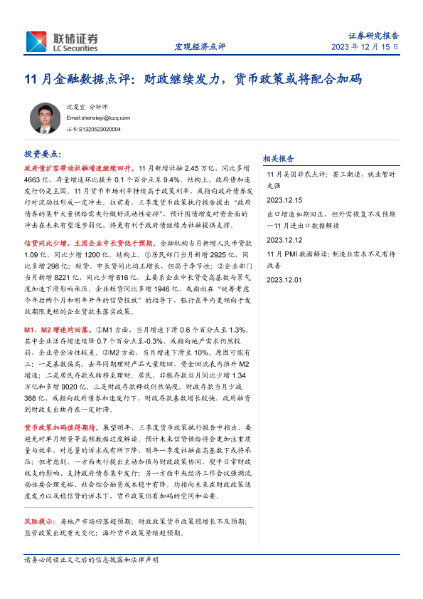 【联储证券】【20231215】11月金融数据点评:财政继续发力,货币政策或将配合加码-12页
