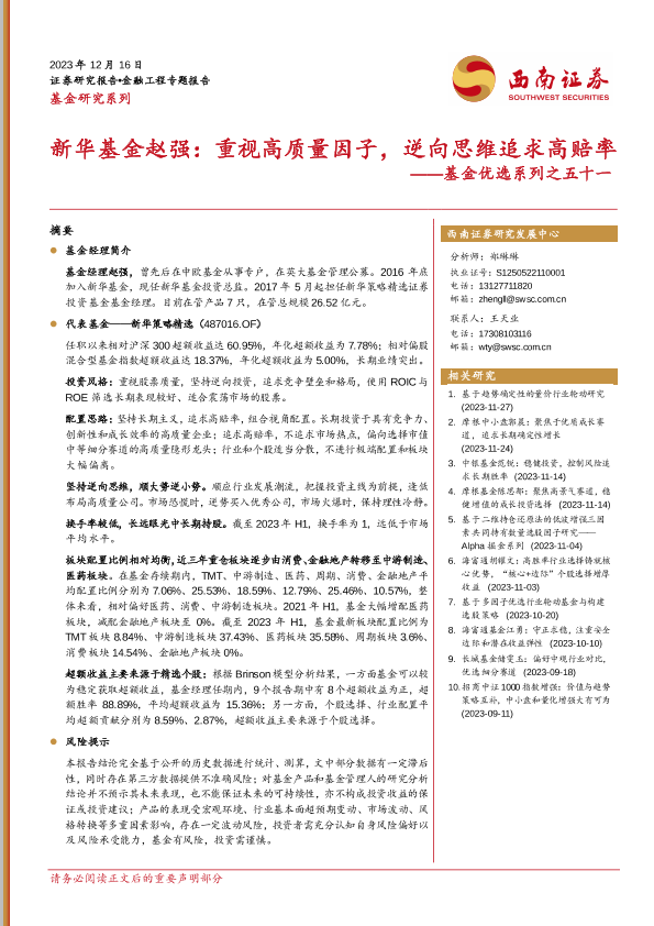 【西南证券】【20231216】基金优选系列之五十一:新华基金赵强:重视高质量因子,逆向思维追求高赔率-24页
