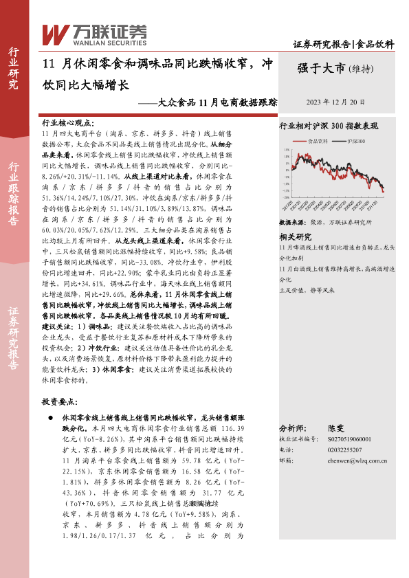 【万联证券】【20231220】大众食品11月电商数据跟踪:11月休闲零食和调味品同比跌幅收窄,冲饮同比大幅增长-13页