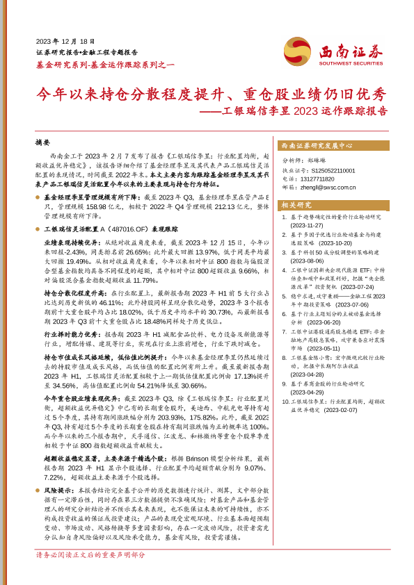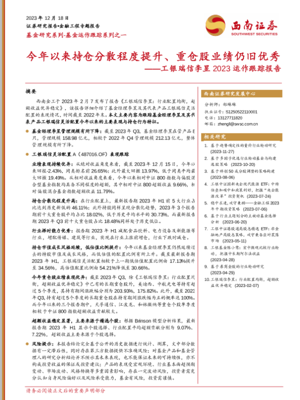 【西南证券】【20231218】工银瑞信李昱2023运作跟踪报告:今年以来持仓分散程度提升、重仓股业绩仍旧优秀-19页