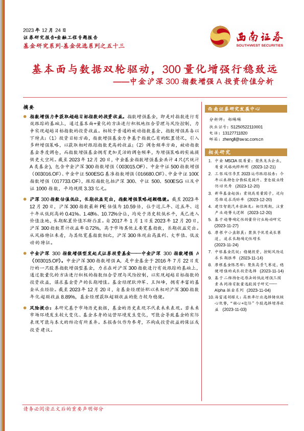 【西南证券】【20231224】基金优选系列之五十三:中金沪深300指数增强A投资价值分析-17页